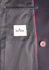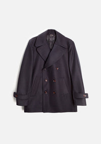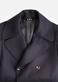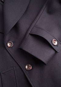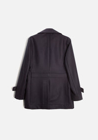 The Amarante coat stands out for its elegant, classic design, with contrasting front buttons and decorative epaulettes adding personality and character. The slanted pockets with piping, cuffs with loops, and collar with visible stitching enhance the finish, showcasing a garment designed to combine style and functionality. The matching fabric inner hanger completes the careful craftsmanship.