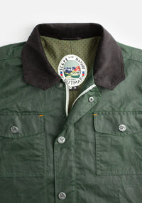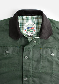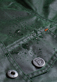 The Bourke Wax Jacket is made from waxed Scottish cotton, a finish obtained from a thermal process that reuses plastic and oils, providing water resistance and an unmistakable vintage style. Its corduroy collar adds contrast and texture, while the utilitarian design with multiple pockets and metal snaps evokes character and timelessness.