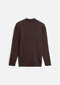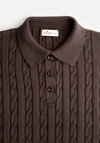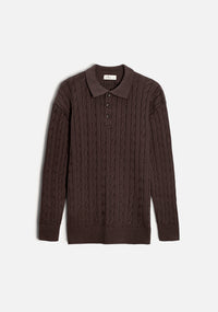 The Turin Sweater stands out for its continuous cable knit on the front, sleeves, and back, a texture that adds visual depth and timeless character. Its ribbed polo collar creates an elegant balance between classic and contemporary, accompanied by three front buttons that add versatility to the design.