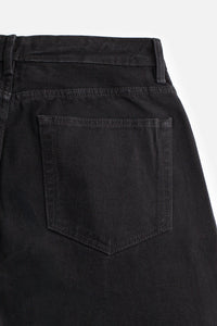 The men's Kubrick jean, crafted in a cotton-viscose blend, redefines the classic silhouette with a straight boot and garment-dyed design in a sophisticated black hue. It features the iconic five pockets: the watchmaker pocket with a rivet on the side, two strategically placed front rivets, and two back patch pockets with cutout details at the mouth.